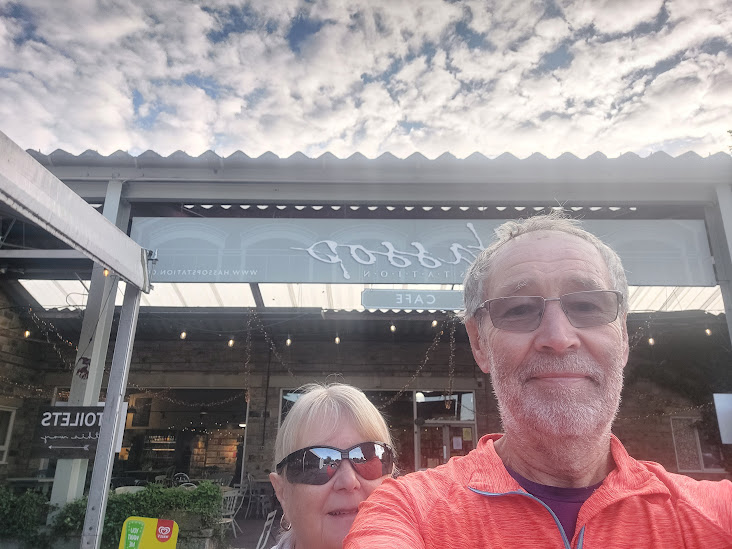 Having read-up on it, the Bakewell parkrun took the old railway route from Hassop to Bakewell and back again. So 8:30am we drifted out of our room, crossed the car-park and joined the home crowd and tourists for this reasonably flat run ( it was a railway line so this gave us prior knowledge). The route was a definite down hill gradient, passing the old Bakewell station before an about-turn and a slight 'slog' up hill to the finish close to Hassop Station. Plenty of folks to chat with and a good crowd of cheery volunteers. The Station has been converted very sympathetically to a large cafe and a bike hire/sales/repair shop. Needs must and we took advantage of the 'included' breakfast with our B&B which was superb. Cereals, fruit juice, full English or whatever you want, toast, tea and as 'guests', the luxury of table service and no parkrun, bikers queues. Quick showers and back down for afternoon bike hire and a half day ride to the top end of the line and back with a cafe stop half-way. So, highly recommended for an overnight or several days, lovely parkrun, nice adjacent cafe, close to Bakewell to walk a couple of K's down the old railway into town for restaurants etc. No parking issues and no probs to have a few drinks!