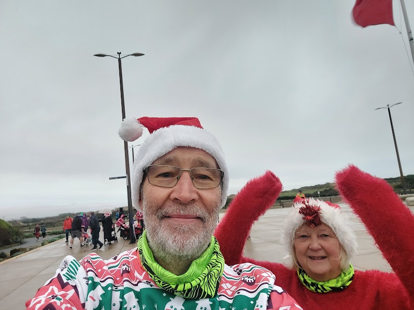 It's Christmas eve morning as we leave home for the 700 bus at 8:10 am and it appears to be running to schedule today. We must have looked a sight as we boarded the bus in our running gear and Santa-hats! Just one other traveller on board and a lovely looking sea as we approach Marine Drive. With hardly a person at any of the bus-stops we arrive pretty early in time for a loo break and a short jog warm-up. Already a handful of suitably Christmassy parkrunners are milling around sharing lighthearted stories and anticipating the numbers expected, but no one thought nearly 700 hardy soles would run, jog, shuffle, walk, push buggies, pull or hold back their canine companions as well as a good turn-out of high-vis volunteers who make these events possible.