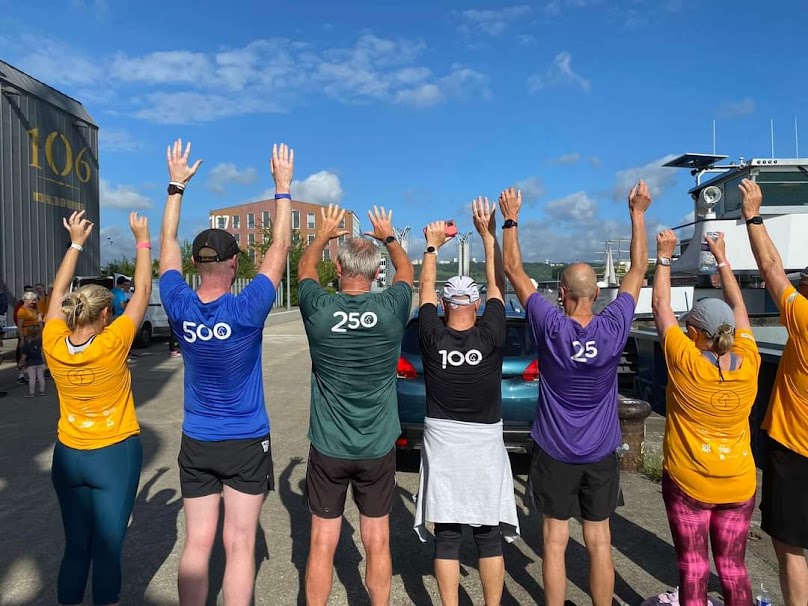 We soon spot a few 'Striders' with their distinctive orange vests and get down to do the obligatory photo shoot of around 10 club runners, not an easy task as they have pop off for a loo stop and do their warm-up routine. Following the briefing we are off on a nice steady trot at the maximum Lesley can cope with. We do the up and back and up before I am told to leave her behind and do my own thing. I shuffle past a 'support the lifeboat' T-shirted lady who apparently was going to do a club-swim after her run! Brave or silly, I have no idea. I finish in a reasonable time and cheer Lesley over the line, about 1 minute behind me. The Striders are all there to cheer her on and we gather up our warm gear to walk back along the riverside path to one of the Strider's trendy riverfront apartment for a nice post run chat with a post run coffee and cakes! We take up the offer of a lift home and the bright and chilly Saturday morning ends very nicely!