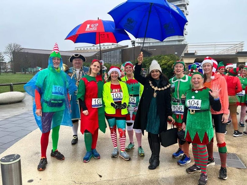 Almost 400 parkrunners shared this amazingly moody sea scape of a hazy sun and damp promenade. Lesley soon found a slow recovering fellow club runner to encourage, chatter and generally, share the 57 minutes with! I, decided to take things 'easy' finishing in 34 minutes after joining the last 3 km with 3 lady 'pacers' I put in my usual 'excuse' for a sprint only to be left behind by the said 3 ladies who did a better job of a final push to the line than me! Still, It's not a race, we keep getting told. Sunday, rain is forecast for most of the day. It's intensity will vary from heavy.......to very heavy with localised flooding. Not the best for fun enjoyment. We decide to drive and park as close to the Splash Point green where fun and frivolities, loud music and registration is already on the way. Between the gloom we had spotted a few elves emerging from vehicles, their gaiety covered in waterproofs in an attempt to keep out the damp for as long as possible. We had our 'emergency' ponchos that really looked quite fetching....not! With the aid of a charity shop and random stuff in our wardrobe we looked like a couple of ageing elves to be sure.