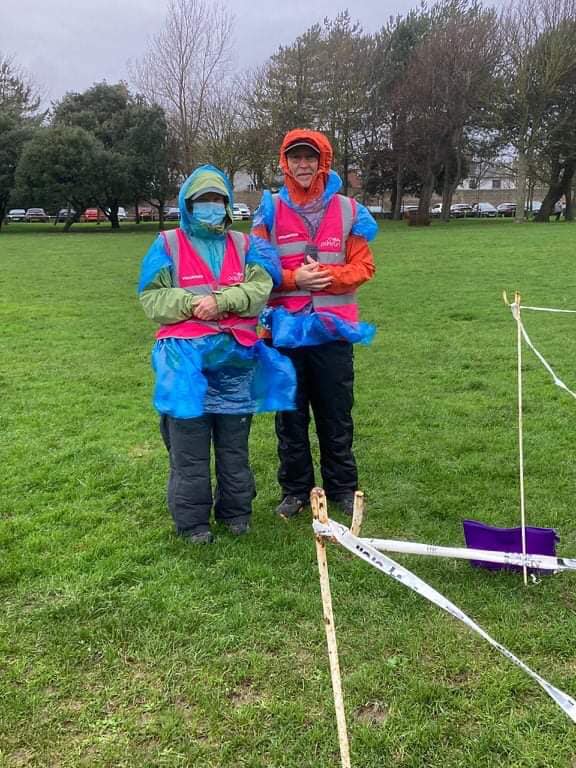 Our dress sense was captured by a parkrun photographer that soon went 'viral' on Facebook! If I start at the bottom, extra warm trousers that we purchased from a well known Japanese shop in Oxford.......brilliant, no wind penetrates and no heat loss, waterproof walking trousers, Runderwear long sleeve base thermals, fleece, waterproof trekking coats, ex-Moonwalk (London) poncho, high-vis, gloves, but removed as we were doing 'tokens' and dexterity is a must for the 266 slightly mad crowd of parkrunners. Peak caps with hoods-up and in Lesley's case, as she was customer facing .... a mask! It all went very smoothly with Mike parkrun, a frequent RD at Worthing, welcoming the soggy parkrunners to 'sunny' Worthing and we welcomed the even more soggy group, back with their tokens! Even though a fair-few looked cheesed off, they at least turned up and many thanked us for volunteering in such awful weather.............shame really as Sunday was the exact opposite with a chilly, fresh, cloudless sky, perfect for running but hey-ho!
