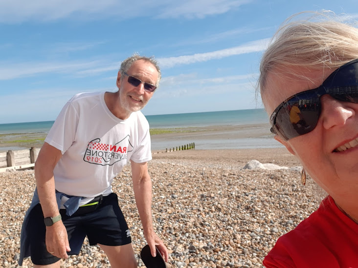 By the start we partake in the enjoyable and very 'parkrun', social catch-up with the friends we have made and then the always sudden & wobbly, pebbly off after the essential briefing. We both run together at what seems a reasonable pace.......for us. The sun soon warms and the breeze going west is nil. We pass Maurice early on, the 75+ who always starts near the front of the crowd (450+ today). Maurice is great, each week he sets-up and takes down the funnel, then runs when he feels fit and his dodgy knees aren't playing-up too much and always finishes in a competitive 33+/ 35+ minutes! He has already told me that the 4th jab has taken the oomph out of him....but his pace seems pretty good to me. Jogging together we overhaul a few and get overhauled by a few as well including a 'mum' with a double buggy! The way back from the, almost half-way turn, has just enough breeze to keep you cool and we both finish with a 'sprint' at around our flat-run PBs. It's warm enough again to stay and cheer on the tail, chat a bit more and of course, coffee and cake at Coast outside on the beach.The new long bench and tables encourage more after-event conversations as sharing seating takes some of the British reserve away!