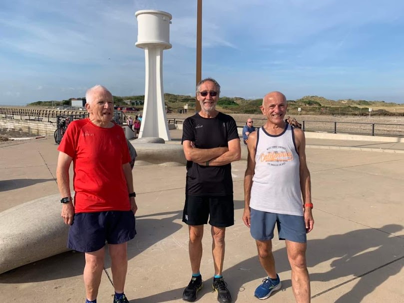 A big contingent from Worthing joins in with the local crowds and boosts the numbers to well over 300......and it is alsotheir 100th, so cakes at the end!. It's hot, so not fast, just an enjoyable out and back and out and back again! I just pip Maurice and finish 2 minutes behind Lesley. It should have been Bognor this week but our fabulous Stagecoach busses.........mainly a rude driver.....said no way. For us it was just a run so we could simply walk down to the beach and do Littlehampton but for others they were trying to get to work at care-homes, shops and nearby, Butlins. I trust the bus driver will get his come-uppence one day!