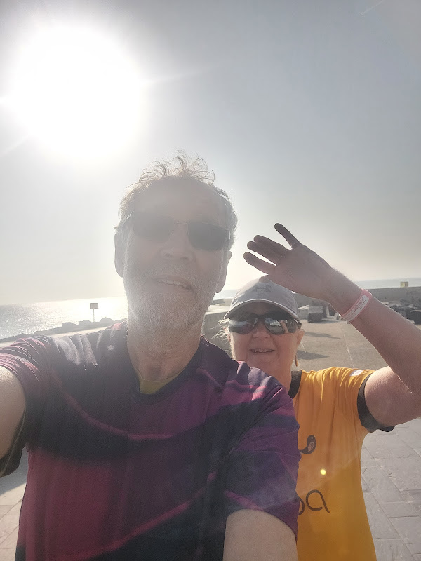 Mandatory selfie taken, and both in our lightweight summer attire, no sleeves, warm hats (only peaked for sun) or gloves and me in shorts! I decided to run with my now, 4 weeks of leg thingy. Wise or not? 3-2-1 & Lesley seemed to disappear into the morning sunshine without the hint of me trying to follow...... with that annoying shuffling sound ( I don't think I do !) I can't say it was comfortable but I think I will have to live with the pain or stop running and all the problems of becoming an overweight, lifeless, couch-potato! Slight exaggeration as I still walk well and often and go to the gym etc. Somewhere in the middle 30's would be good as I high-five'd Lesley just after the Canada flag, me going west and Lesley going east, on her way back! As I approached the finish line she was cheering enthusiastically with a hint of smugness, knowing she made a good time.......yes, it's another PB. Me? around 35 mins, as hoped for, with an aching upper leg too-boot as we sat for coffee and munching croissants upstairs at Coast. The day was so good we walked back, all the way passing enthusiastic swimmers taking advantage of the mild, sunny and very calm sea.