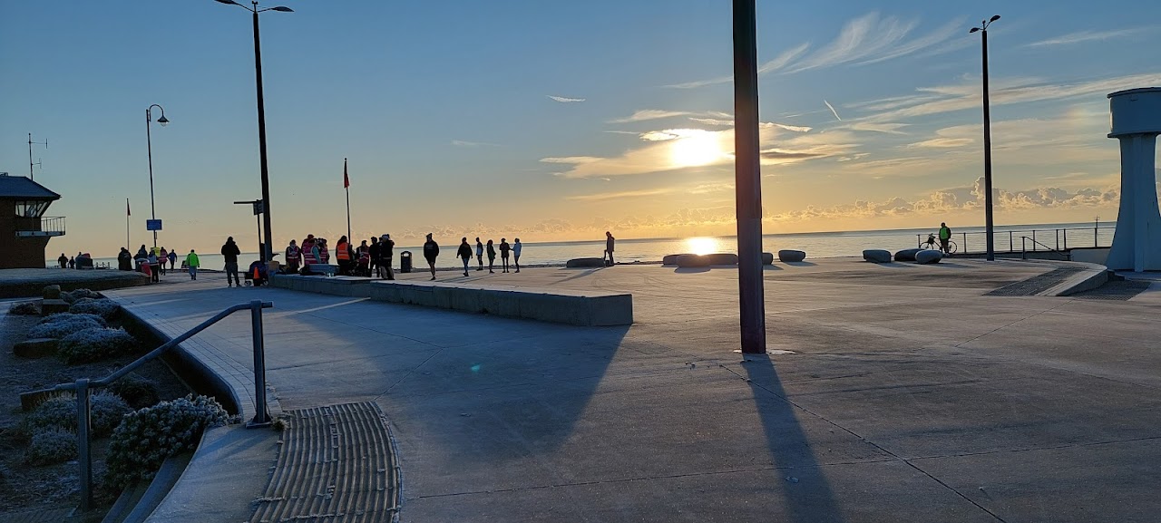 Weather warnings issued, -15C in Scotland and days of below temperatures as far south as.......Worthing! or to be more precise Littlehampton! Yes, its the Striders mass participation week at Littlehampton promenade parkrun........and it's chilly to say the least. It's decidedly chilly with ominous clear skies as we stroll down for the 700 Coastliner that arrives thankfully, on-time, at just after 8am. We jog down to the prom from the Anchor Springs bus terminus. Just as an aside, whoever was responsible for naming the bleak & dismal bus-stand must have a huge sense of imagination or humour!! The sky and the sea are just stunning and even though we are next to the 'warm' sea the prom and beach are glistening from the hard frost and low sun! -4C someone muttered through their breath. Despite it being 8:45am just a few parkrunners had gathered to join the full contingent of hardy volunteers. Gradually folks appeared, rubbing their gloved hands together....as you do...chatting and joking but all are drawn to nature's spectacle on this unmissable morning.