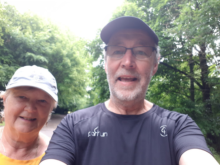 It seems to be like a freedom run but you will be able to record your times etc. on the official parkrun site. Though it will have no T shirt rewards, no volunteer roles and you are able to use any 5km route to walk, jog or run. Let's see how it works as it is due to being launched next week. Back to us and we had a busy week with the exiting arrival of our new shed at our allotment. So far this has kept me quite occupied with the base and floor taking several days and I still haven't started on the main erection as we are waiting for a couple of non-wind-gusty and dry days to make it more enjoyable than dodging showers and battling to hold the panels up. As with the rest of the week, Friday (our usual non parkrun day) was so busy that we left the run until early evening and judging by reports as to how busy the woods were all day, it was a good bit of forward planning and just for a change, because we can, we decided at the last minute to shuffle the 'old course'. Starting at the post, we were soon off, clicking our Fitbits in unison and as we were passing the finish post, just a 100 metres up the path, 2 other runners that were passing us were both clicking their watches too, but to finish. I asked their times on passing and it was 26 something so not quite in the same class as us! We still had a full circuit to do at this point when Lesley announced she had 'the wrong bra' on. Unbelievable, she also had forgotten her wristband barcode......unforgivable if you ask me! The upshot of this inappropriate clothing issue was to be a slower time and uncomfortable joggle. Luckily for her there were almost no spectators today, as it was getting late, so she managed to just keep going albeit a bit slower....in fact about 5 minutes could be added to her time for her senior moment! I felt OK and was fully clothed in my 50 red T-shirt and apart from the odd normal niggle jogged happily with her until the last straight when I found an extra bit of pace, knowing the finish on the old course would be at least 200 metres earlier than the current course........if you get my jist? So 42 minutes it was and 42 + for Lesley and no coffee & roll as the cafe was long closed as it was now quite late.