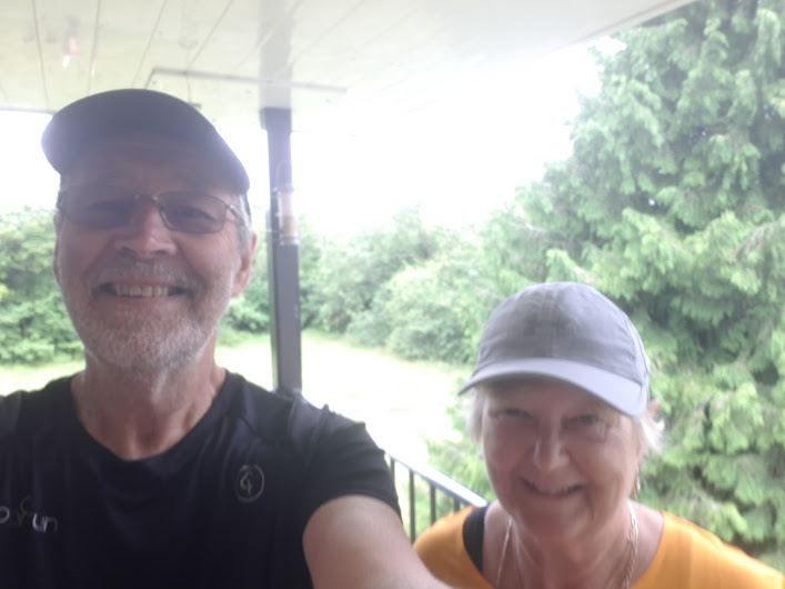 not-parkrun 2 and freedom 15 with an ultra-early start as we have had the lower 30's for a few days now and there is no way ( at our age) we could possibly run safely in those temperatures. At 6: 45 readiness and off to the start it still feel warm. I still have those annoying 'heavy legs' and just the hill up makes me think that today will be tough! If I can get round in 40mins I will be happy, so 8 min kms is a target, with hopefully a little quicker on the downhills and flat sections to compensate for The Hill & peak. We knew our parkrunners had been out in the woods but with all the paths, time-slots etc. we seldom bump into them but yesterday and today were to be an exception. Whilst on our speedy walk on Thursday we came across Richard from our 'core team' who was wisely walking up The Hill in the middle of , what sounded like to us, a long morning run. We stopped him for a chat and he said he was keeping fit with 3 runs per week. He said he would finish up later for coffee in the woods-cafe and that is where we found him again with Dan, walking his dog and also stopping for coffee! We all nattered as there was 15 weeks of catch-up.........still (just) at a 2 metre distance. Dan tries to walk 5 miles per day with hound as well as mountain biking. He is one of our main stay regular volunteers, runner, core team and RD. He, like us and Richard had missed holidays but on the bright side, we were all keeping well! The Friday not-parkrun went as expected, Lesley just made 38 minutes and I made 40 minutes....just over. We had vocal encouragement at MP6, the top of The Hill, from Dan who for the 2nd day we passed, walking the dog. I struggled along the top and was pleased to see the (old) finish and a nicely placed log to sit down and recover!