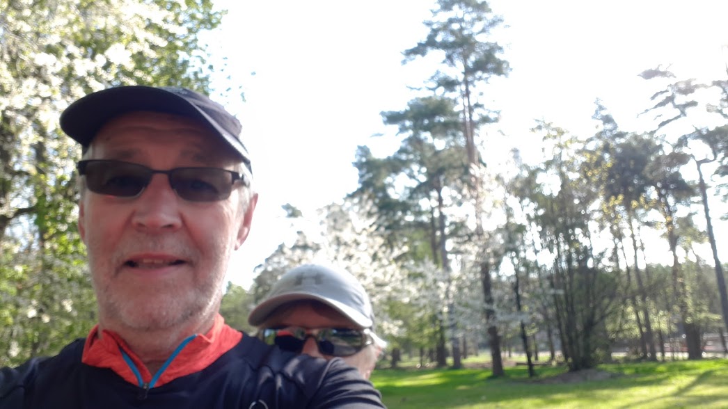 Back to the 8th Friday parkrun and it is almost warm as we attempt to make it a 9am start.....well 9:13, not bad. Just shorts and parkrun tops today as we both agree that under 40mins would be a bonus. The lack of crowd today (and every freedom parkrun day) will mean a slow time. It is so dry underfoot that just normal trainers today as we jog off together. The woods are near deserted even though it is VE day bank holiday! People are chilling today perhaps or just too early? We acknowledge each marshal point, no marshal, in a slightly crazy way. The Go Ape turn no-marshal,the Toilet Post no-marshal, MP3 no marshal, MP4 Hairpin....no marshal and so on until we are puffing too much to speak! Nobody is watching so who cares? The nice sections are all too soon over as we turn towards The Hill with no pre-plan in place we just see if we can keep jogging, albeit very slowly, right to the top and round MP7! We do and whether this is a game changer with lowered overall times will be seen later. We keep going up the viewpoint with the distant memory of a stumble, before Lesley has enough pain in her toes and leg to ease off some 30 yards behind me. The gap remains to the finish line where we both finish in 39 something......so no big gain from The Hill tactics then!