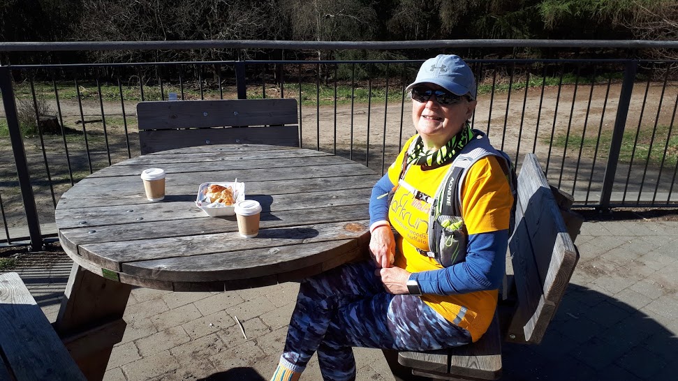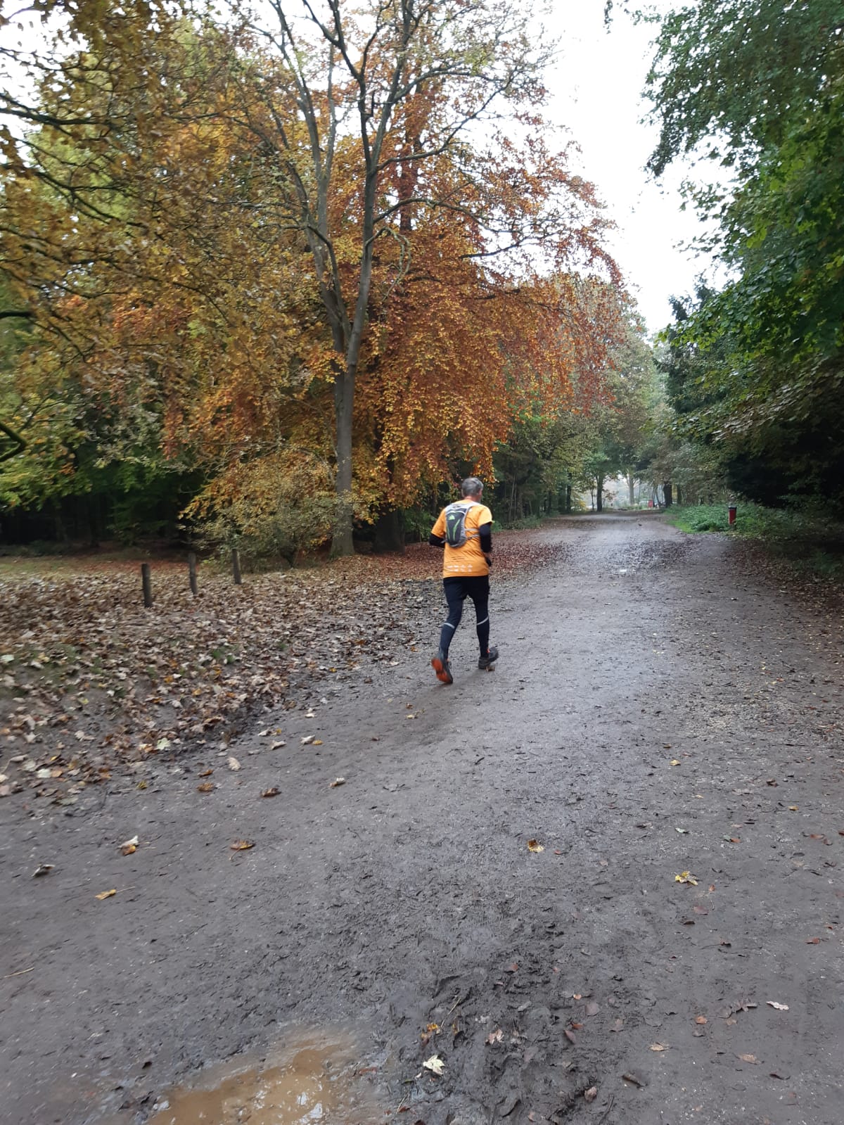 This section is usually nice and firm, if not, too firm as it has been resurfaced with overly coarse stones that even after 2 years and many thousands of feet, tyres and horses, they have not bedded in well. Today, its mostly slippery wet leaves and deep mud! Undaunted, we continue to the turnaround post, a memorable marker if we have to do this route again next week(s). Now it's just a head-back up a long drag until my 'Fitbit' beeps first to tell me it's time to click and slow to a walking pace (not a great deal of change from my 'hill shuffle') We met 2 'On the Run' ladies at the top, just into their muddy run through the woods and had a brief catch-up chat before back to the cafe for 2 flat-whites but no cakes, as we have both put on a little excess bulges over the last few weeks or months. Nice run today though and even nicer to be able to still go out and 'enjoy' !