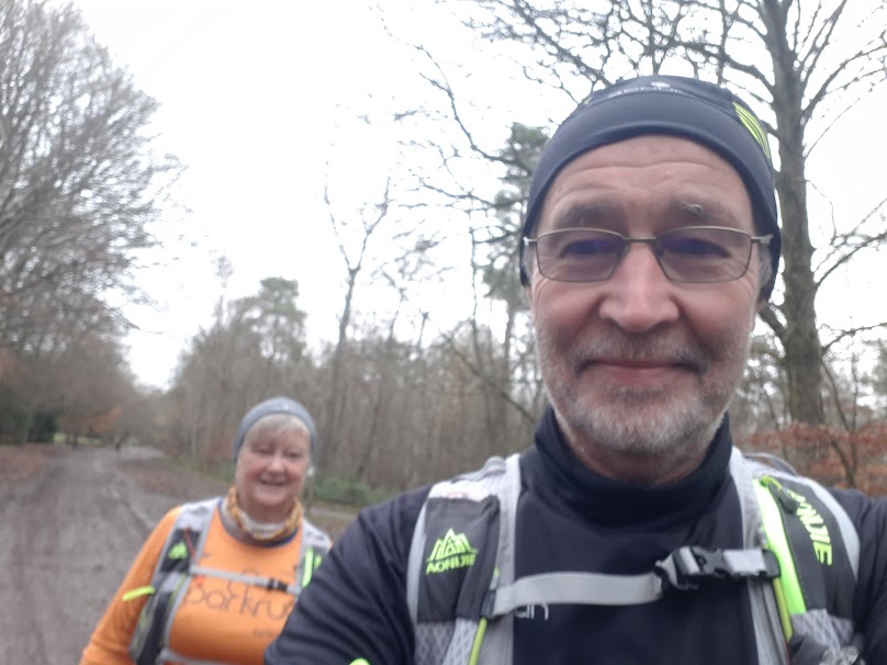 We weren't disappointed as we slipped and slid our way up the chalk paths to be greeted with........more mud. Our friends at Forestry England had chosen this relatively quite spell to take their big fat tyre trucks, high-vis chain-saw gangs to decimate the already squelchy track and bring down a few trees as well! On the plus side, the aroma of freshly cut pine permeates from the woods almost giving a feel-good smile as you pass by the cuttings. Back to the run...............and I had a small painful hip issue that I felt sure would 'run itself out' today but just in case, I let Lesley go off on her own.........well, I saw her disappear in the distance and trotted off. With the exception of just a few spots, it was a bit of a "muddy-mucker' again but this time there was little point trying to choose the best route through the puddles as horses, bikes, 4 wheel drive forestry trucks and humans had made this a 'just go for it and hope for the best' plan today! I have to clean muddy boots so a bit more mud on them would make little difference. Lesley finished in 39 something and me in 40 something so all in all.......a good result.