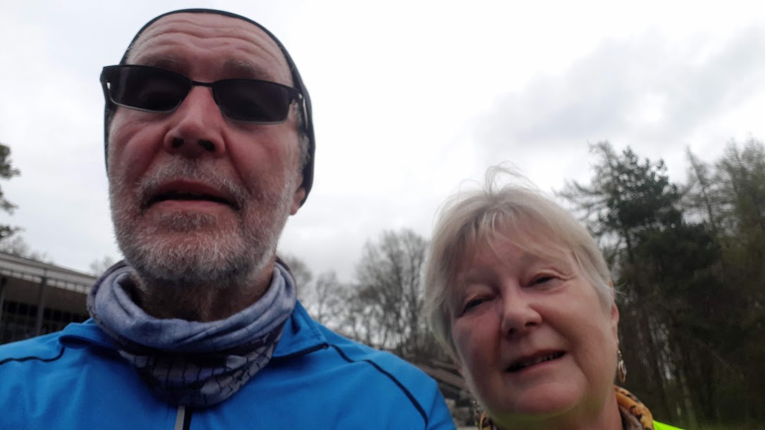 Our selfie start by the post as usual and as we headed for Go-Ape turn with the sound of mud-spray from our feet, along the top track, alerted the few walkers that we were coming at 'speed'. Passing the cafe we were spotted, probably from our show of parkrun T-shirts, by a young lady " excuse me, I know you are running the parkrun.......where does it start and when will it be"? We felt it rude to ignore her and paused to explain, "soon we hope, meet here, 8:45am at the latest, check the web-site for more details" . Off we went again, thankful that we had been such helpful advocates of parkrun and grateful that Strava records only the time we are running, ignoring pauses! The rest of the run is uneventful, which at our age is a good thing? The Hill we managed to shuffle all the way, we ignored the muddy patches and just waded through. We slipped up to The View like an accomplished ice-skater, one step forward and 1/2 step backwards. I patted The Post like a long lost dog grateful there was now just the long incline all the way back to my finish at The Poo-bin in 41:31 and Lesley finishing 60 metres before me , but just behind me, in the same time.......exactly according to Strava! Mystified, we amble back to the cafe to enjoy our flat-whites on the seat outside, in relative warmth. It is slowly getting warmer every week if only we could have a few days without rain to sort the mud out..........it would be perfect!