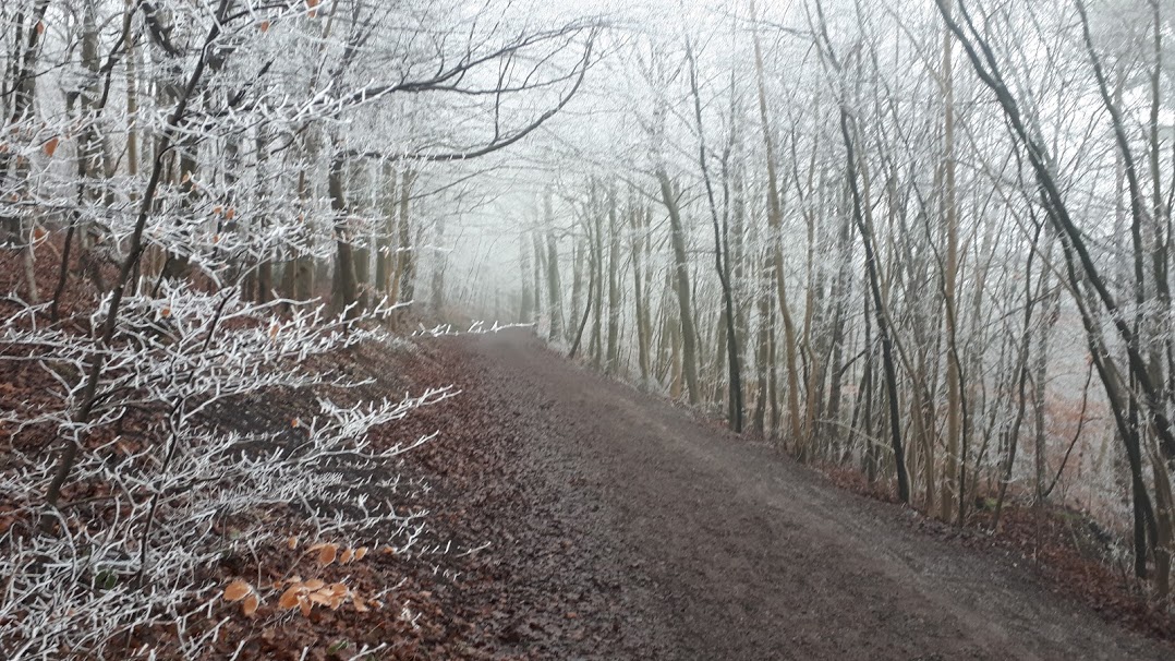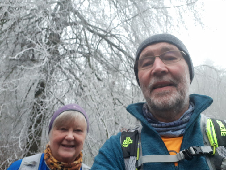The higher we went up the colder, foggier and prettier it got. We were blessed with the display and the welcoming crunchy sound underfoot on the tracks, that were bound to be slippery but had at least frozen the mud of the last few weeks. Fitbits synchronised and off we shuffled. The cafe was soon passed by and was already open and ready for the hordes, that we hoped to avoid today, as we passed by (the other direction) our first runner of the morning and descended the distinctly frosty Gruffalo Hill. There were just a few dog walkers to bid "Happy New Year" to, as we trundled, mainly downwards, to almost the Half-way Post where we doubled back for a few paces ( to make up the distance) and took the sharp left (right if you get my meaning) and encountered The Hill Mk2! With just a few strides upwards on the skating-rink-like path had us throttling back into walking mode. It seemed to us the gradient would not benefit our run-time trying to shuffle or, more importantly, do our ageing tickers any good at all.......especially so early into 2021 and with the hope of our Covid-jabs just around the corner (not literally)! It seemed an age to reach the top and indeed Strava did confirm this when we later checked out the segment time, back in the warmth of home. Left at the trail to meet the 'unsafe trees' barricades and a right fork to continue back along our usual course. This section has a nice descend before the treacherous view-point. Treacherous, only because I took a tumble some time ago while looking at the valley view. No point today as you could barely see a hand in front of you due to the freezing-fog and looking down at the path is particularly important to avoid flint trip-hazards and over the last month or so, to choose a route through the muddy quagmire. No such problem with mud today as jack-frost had sorted that. Lesley was just behind as I pointed out to her that it was now snowing! Very pretty. We had decided that the course today would be a little shorter, even with our 200 meters 'double-back', so we would run, passing-by the Poo Bin finish and on until our Fitbits beeped at 5km. We would then stop watches and stop shuffling. Well I stopped just after the Monkey Van and just before the new start & finish whereas Lesley had to keep going before her beep signalled her to stop beside the old cafe, some 200+ metres further on! This discrepancy meant I finished in 44:18 and Lesley was just 45!