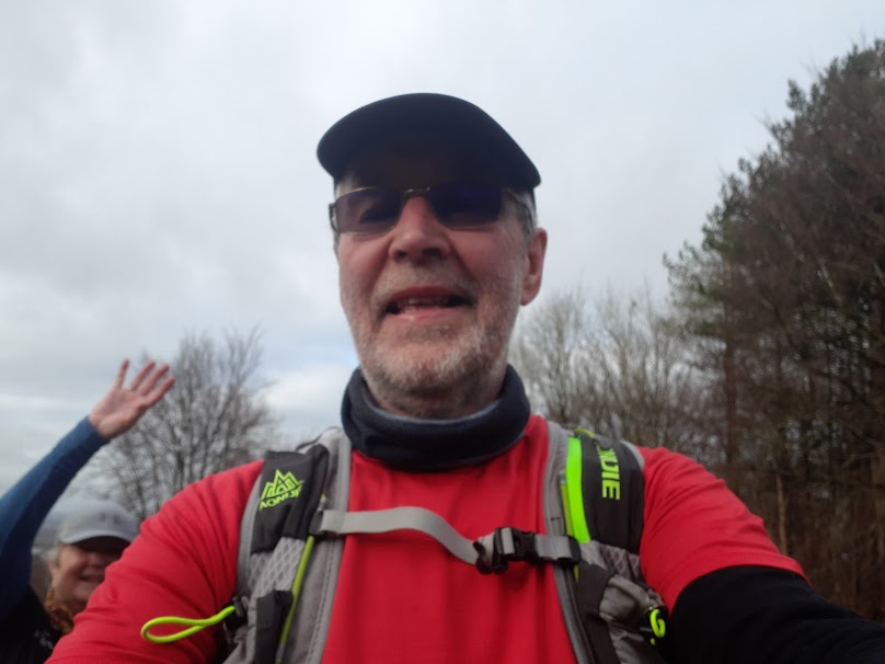 We take the now obligatory start selfie besides the 5km Start Post with full regalia on that consists of or huffalo & puffalo parkrun orange T's. A little under-warm protection as it is still February and only just hovering round freezing. We read somewhere that you should dress for the 2nd km. Due to our age and pace (slow) we dress always for the 1st and just lately carry our lightweight coats in our back-sacks to store whilst shuffling and then donning for coffee and walk back home. We are going to stick strictly to the 5km course with the exception of The Hill as it is still, annoyingly, closed to through-foot! Forestry England have left a message on their Facebook page to not move (or vault) barriers where they are out as the trees are very dangerous on these sections. We will conform but are pretty annoyed now that it is 3 months now that a designated public footpath has closed without the proper notification and signs. We are happy that in an emergency they can do what is necessary but come-on......3 months.........1 tree!! So, It's 50 runs with just the two of us but just as we are about to start, two On the Run-ers appear. We see them most weeks at around the beginning or near the end. They usually start their circular run in the village below and end back where they started after around 17-20 kms. Lesley had been sworn to secrecy on Thursday when an email came from parkrun to say they would make an announcement soon regarding start-up!