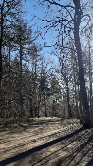 Sunday is not a favourite day in The Woods, especially in lockdown as hordes of pepes arrive and stroll around, just generally getting in the way and not getting out of the way to let us pass. Not-parkrun 48 must be done and the weather is on the turn. Too early and it it would still be freezing, too late and the trail would be slushy mud again. 11:30am and it was just right! We did slightly over dress as the wind had picked up and it was still around zero......and we aren't getting any younger. The Snake up had to be negotiated first, just to warm us up and already we saw more people than a normal, no-work-day, Friday. It was decided to start at The Roundabout and run our normal route finishing wherever 5km buzzed on the Fitbits. Up with our snood masks and brave the 'crowds' as we pass by the cafe and the dawdlers going down Gruffalo Hill. The trail was near perfect with just a hint of ice in a few places but certainly not enough for our 'Run Director' to call a halt! We had decided earlier to do an about-turn at The Hill bottom and return our steps but with the 'dodgy tree' barricades being pushed to one side we went for The Hill for the first time in weeks!
