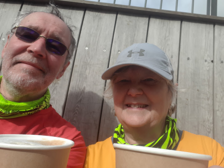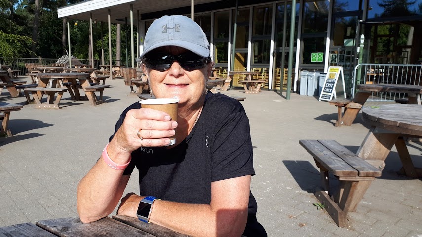 The wind strength was quite considerable as we walked up to the start with the almost obligatory selfie, just for the record! There are more people around now the carpark and cafe are open but certainly once the Gruffalo has been passed there was just the odd runner, dog walker and pushy push-chair parents, to pass by at 2 metres, without issues. Gentle was the order of the day as we checked out the halfway post at just over 2 km (old start post)! before The Hill beckoned. Both of us shuffled without a walk-break again, must be improving our hill work! We rounded marshal point 7 and headed downhill to the fork at MP8 before the long slog back through the trees, passing the roundabout, the old start, the old finish, the Go-Ape turn and back to the start/finish. Lesley continued on until she clocked up 5km at the table tennis tables after looping back.......some 200metres further we calculated. I checked out my Fitbit and I stopped it at the finish and it read just over 5kms! However on close scrutiny, it must have lost the plot on the way round with a few extra zigzags put in, so we are both non-the-wiser! All the latter pales into insignificance as a coffee and bacon roll were almost ready to be consumed.......seating outside the cafe only, where it was pretty draughty and we soon went from sweaty hot, to cold and shivery! I hope this virus is beaten by winter as the post-cafe thing is really not going to work on chilly parkrun days! As we arrived back out of the woods to our development we had a brief chat with a guy that had seen us time keeping at parkrun etc. and we had seen him run. He hasn't done the circuit since shutdown but runs 5km around the estate! We have spotted him jogging past us, looking at his timepiece and weaving back & forth........obviously......to get his distance! Weird bunch joggers, aren't we?