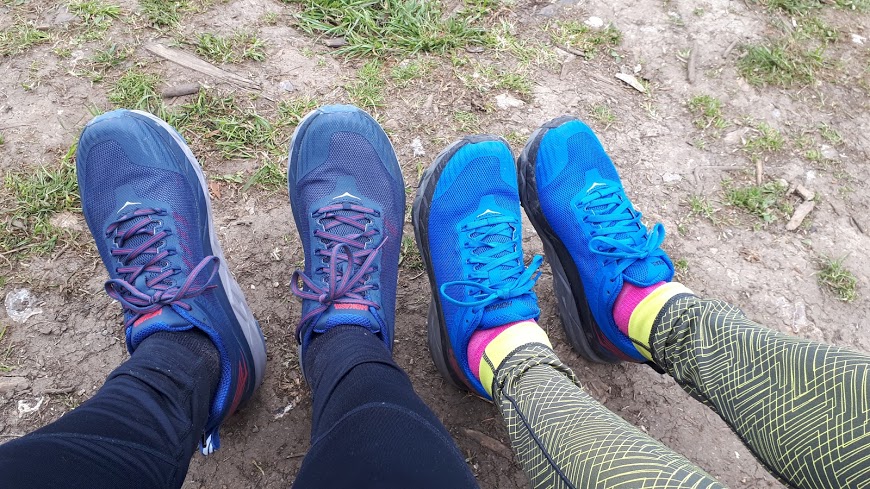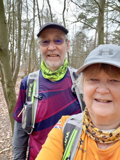 Saturday and it's just after 8:30 when we start at the post in a wintery 4C but no rain. In fact it has been dry and a little Spring-like for several days that gave us a decision making opportunity at banana breakfast of whether to wear our new Hoka trail shoes and the picture shows.....we did! In respect we tried to wear black kit today but the garish colour shoes and stripy neck-things and Lesley's leggings, didn't quite work! As it was a Saturday morning and early the woods were sparse with just the usual dog walkers and gradually a few runners. I think we both felt good today and relished the no-mud and anticipating our lightweight Hokas might make a small difference to number 56. We shuffled together for almost all the way admiring the display of primroses on Primrose Hill but at the turn Lesley was happy that I went a few metres in front at the The Hill and stayed that way passing The View and touching The Post. Certainly, the new shoes were feeling fine for me but the last 2kms section of the not really flat but uphill before the Poo Bin was still a struggle. I clicked at 5km and Lesley, just a few yards behind, did hers. 38:15 !