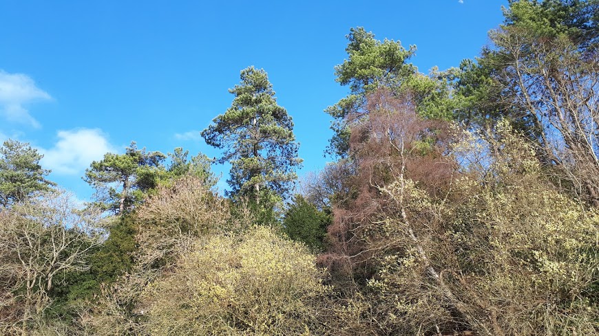 She had put it off once until she hoped the effects of jab number 1 had 'kicked-in' making the visit safer. No need to have worried as it was just a temporary filling again as it needed a longer appointment! So more fear and trepidation to come later in April. Although we are now into March, we seemed to have slipped back to mid-winter today with temperatures barely above freezing, even at 3pm. So thermal leggings and under things, lightweight coats to put on before the start and at the finish, selfie taken and off for the nearest 5km route we are able to take to the actual course which means, walking up that steep trail after doubling-back at The Hill barriers! Just before Go Ape a couple of Forestry England trucks pass us .(see later for explanation) It is reasonably busy, considering the extra chill in the air, but being the afternoon the kids have been 'released' from home schooling and are letting off steam around the play-trail. Not much longer as this extended holiday break comes to an end with schools starting from next Monday! On and downwards passing the Gruffalo with only a slight muddy patch from recent rain before rounding The Hairpin, up the gentle rise of Primrose Hill that should soon be back in bloom and onwards to take advantage of the early downs before reaching the turn to The Hill.............no barriers! The forestry guys are loading them onto the trucks and we are given the 'thumbs up' & 'all clear' to legitimately ascend our 'favourite' section, the first time in over 3 months. The haul up is with our usual shuffle and head down so we fail to notice the dangerous, ash-dieback, felled trees but we do spot them on our walk back home. The ash trees are pretty close to the trail and the stumps and debris are looking rather sad as the disease took them well before their time, leaving only logs that I am sure will come in useful?