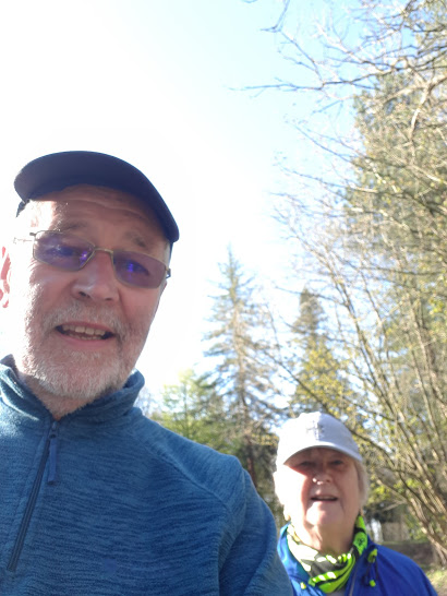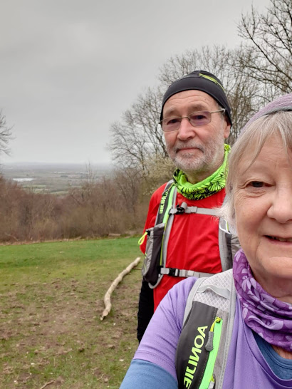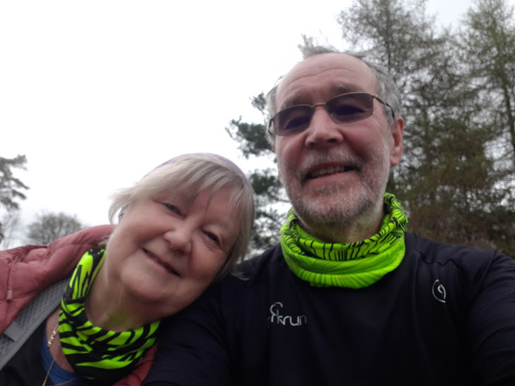 This should mean a harder surface and perhaps some of the worst mud-spots are a little better? We are nor expecting the usual parkrun route as we have discussed the path closure situation with one of Forestry England's wardens when we caught him slightly off-guard during one of our weekly walks. "It will be several weeks yet as they (tree-fellas) have to finish all the clearance and then pick up all the logs and reinstate the tracks" . So a plan B was hatched over our morning tea to start from our normal start and finish somewhere near our normal poo-bin finish, still taking in as much of the course, the 'temporary' barriers will allow. This new course would involve a small degree of doubling back from Gruffalo Hill as far as The Hairpin and back up to then join the Boddington loop beyond The Roundabout. We had one slight diversion which meant a slightly longer route and therefore a shorter finish when the eagle-eyes of Lesley spotted a full set of house keys, along with an Audi key-fob! These were given in to the lady on duty in the Forestry hut and we heard later of an excellent outcome of them being returned to the grateful owner. So our start took us past the cafe, that was still closed as the new 'Covid' hours of 10am-4pm had just come into place, rounding the bend and down to the Hairpin, about turn and back up Gruffalo Hill. This hill, even though it comes early on in our shuffle, is pretty slow for us and a definite feeling of relief as we peak, hand in the keys and continue back along the slushy track towards The Roundabout and left down the hill and continue on the familiar course, giant puddles and all, back to the finish in a not quick, 41:50 according to Strava. Looking back at our times over the last few months and they are slower by several minutes. We don't have fellow runners around us could be one factor, age and few achy joints could be another but the state of course, whilst keen trail runners may love-it, we suffer from the heavy & sticky course and we can't wait for a bit of dryness and warmth so we can take off layers and enjoy! We did however, enjoy our flat-whites and promised cakes whilst sitting outside on bench facing the view and a hint of pleasure from the sparkling morning sunshine. As we walked off to take a long route home a couple of walkers were sharing a lower bench and had 2 glasses of what turned out to be, prosecco. No special celebration they said, just a wonderful day and we are still able to do this! Our walk back soon became cold in the shade of the trees and even though we bring coats with us in our running back-packs, it called for a slow shuffle, 3.5k all the way home.