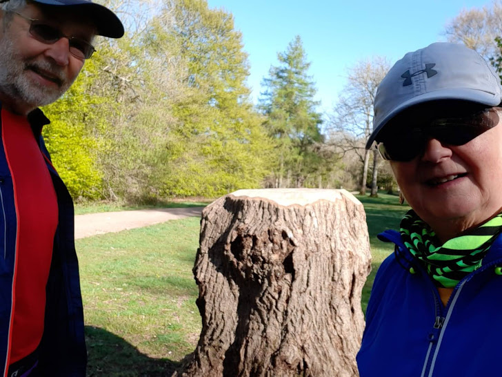 We make good progress through our favourite sections that are mainly downhill and if we keep this up a 36-7 is easily on the cards! We round the T junction to start our shuffle up The Hill and its going well until the sound of a chainsaw and our friendly Forestry England guy stops us going any further! This is a first for us on our not-parkrun to stand for 5 minutes, half way up The Hill getting our puff back at the same time as watching a huge tree felled, taking out many branches from other 'innocent bystanders' in its way! Drama over and we restart with the rest of our shuffle going to plan and we finish in............no idea as I stopped my Fitbit at the tree and didn't start it again and Lesley just has her Strava app that calculated 37 minutes 'moving time', whatever that means! No problems though as the cafe did a social distance bacon roll and flat white whilst we consumed ,almost on our own, outside in the warm early sunshine. What will happen if it is chilly or rains? very few customers, I suspect! We couldn't resist a couple of pictures, alongside a locked-down Gruffalo, on the way back home via a short-ish walk to chill-down! All those children that want to cuddle and pat the lovely fella will wonder why he has a fence all around him "is he really fierce mummy"? or perhaps they are well used to these strange happenings by now