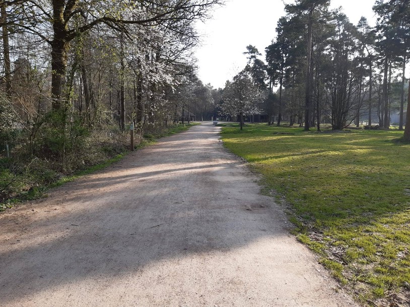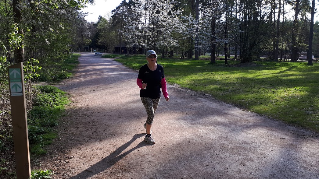 The weather is stunning with the sun peeping over the woods and into our bedroom where we are donning our parkrun attire before the walk up through the woods to the 'start' Spring has definitely sprung and the cherry blossom tree we pass is delightful. We pass, at a distance, our first dog-walker but the woods are absolutely deserted as we do-away with any sort of briefing and burst into life with a steady shuffle under Go-Ape, passing the deserted cafe and down Gruffalo hill and it isn't even 9am! Once around the Hairpin we are on our most favourite section that takes us up to the 2Km mark, gently winding through the woods on a pleasantly undulating track, passing Primrose Hill, the fallen tree (still there) and the sharp right before The Hill. Birds seem particularly pleasantly noisy and planes are still non-existent, with the absence of other people I feel we could soon get used to this........and will probably have to! Huffing and puffing as usual up and up, me counting to 10 or what with walking and trotting and Lesley doing her own thing as we round the next no-marshal corner to a more gentle incline before the unpopular ( with us) down. Today there is no mud, just dust and flint with well trodden by horse verges temping you to take to the grass and avoid the flint only to risk turning an ankle on the deep prints! Veering right and ascending again, not taking in the views but willing-on the activity trail post where the course finally levels out to a more gentle incline. There are just the odd persons around, odd, not in a strange way but they too must be soaking up the solitude of our woods.