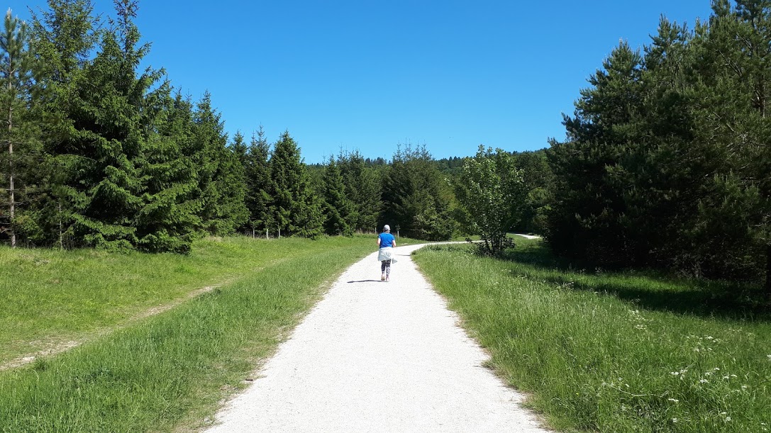 So we jog right down 'The Hill' and beyond the turn ,right to the bottom before taking this 'favourite' spectacular path-with-view back up to rejoin the reverse parkrun trail. We did decide to start walking again later as this gentle path, that resembles Switzerland, turns sharply upwards before rejoining the reverse parkrun trail. Another 'walk' followed just after passing the cordoned off Gruffalo until we summited besides the now busy and open cafe. Crowds meant we took an avoid on to the tarmac road following it downwards against the steady flow of drive-in visitors and paused for a few minutes on the bench with a view over to the Malvern Hills ( really?) Off again on a short stretch of road before the diagonal footpath downhill all the way, shuffling and walking only where dodgy underfoot. After levelling out and nearly back, we met Alison running the other way and paused for a 2 metre social chat. Nice to catch up, she looked fit and said she does something everyday. Hubby Dave was well and we bade our fairwells before arriving home 10 minutes later. Nearly 7km and feeling better for it.......by far! Bring on the coffee and lunch.
