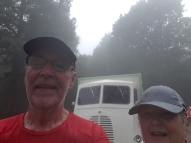 'Monkey Van' joins the parkrun course for not-parkrun 22! As the heatwave comes to a noisy end with a terrific thunderstorm the evening before, leaving a morning of thick mist and a cool 14C ! It's a much better temperature for jogging our 5k but such a contrast with an almost head-torch darkness up through the woods to the start. Not a soul this morning, in contrast to the last few days heat, when dog walkers, runners, indeed anyone that couldn't sleep, took advantage of the slightly lower early morning temperature to do their thing before expiring in 33C of the day!! I wasn't sure if my glasses were steamed up or the mist had descended to ground level as we couldn't see the 'start post' until it was upon us. ( turned out it was a bit of both) Quickly off as the mist turned very shortly to spots of rain as we passed the new addition of a 'Monkey Van' ice cream dispenser! That we later took a picture of.............with us in the foreground!