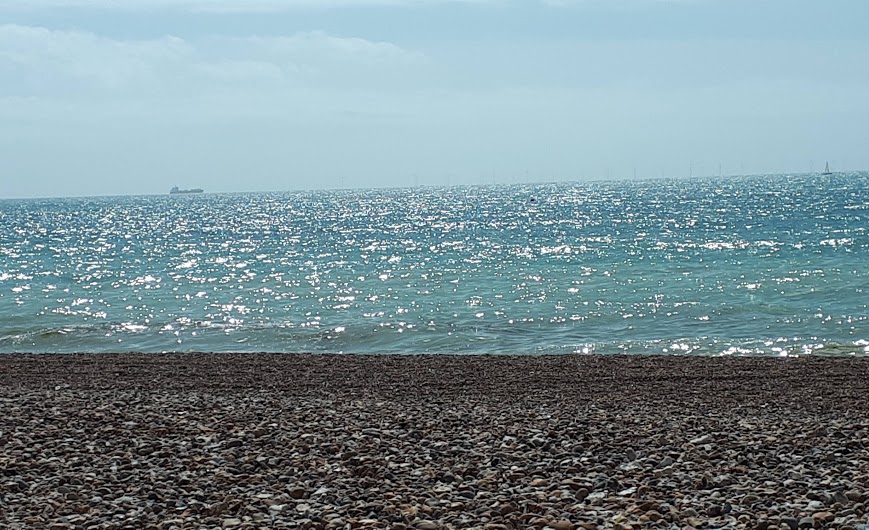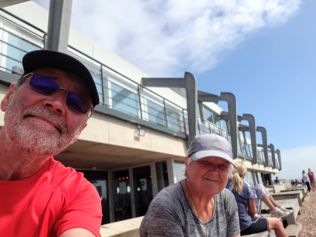 So, with the 'threat' of a warm day we headed on our short drive to our favourite flat parkrun at Lancing Green. We don't do the exact course and especially today as the green has been filled up by a rather large fun-fair! The parkrun normally starts on and crosses the green for a short 'out-and-back' before taking to the tarmac coast path until the about turn at the orange beach-hut. It then re-steps all the way back to finish on the green. We do all-tarmac. Starting at the bandstand and following the same coast path beyond the said beach-hut, round the bollards at the entrance to Shoreham Beach-green and back along the path, finishing back at the bandstand. Easy-peasy, flat with views to the sea towards Brighton and the Seven Sisters on your right and then views back towards Worthing pier and the Isle-of-Wight on your left! The first half ( 2.5km) was 'easy-peasy' but then probably the lack of too much exercise this week and 2 bits of marmalade on toast started to tell. Nevertheless , we finished in a very OK 34 + something, followed by chilled grapefruit juices from The Perch cafe on the seafront. Very wisely, we had packed our chairs, umbrella and swim gear in the car and swiftly retrieved them to sit the rest of the morning on the beach. As can be seen from the picture the sea was near perfect for a swim which quickly eased our ageing muscles and joints and erased the memory of us both huffing & puffing in circles around the bandstand until heartbeats got back under control!