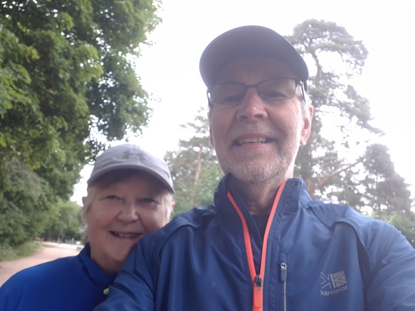 Freedom parkrun number 11 & from Monday we can now socialise.......at 2 metres with up to 6 people, but no family swapping, going from one family to another, and as a 70+ I am still asked to be especially 'alert'. So still no going back to our static caravan and probably still no visits to our children or grandchildren. So it's back to latch-down and it has been a busy week in the allotment, the new shed base is 75% done, hole cut in the fence so we can take a short cut between our adjacent plots, Lesley has been full-on planting as frosts are gone and yes, it has been the driest May since 1926 so our water source of 8 giant tanks, are almost depleted. The forcast is sun more sun and no rain so could be a drought allotment disaster looming by the end of next week.........however today it's perfect for no-parkrun Friday again and providing it is an early start as 25-26C daytime is too hot to shuffle for us oldies. We are up in the woods and off by 8:15am in the relative chill donning our new tangerine sign-written parkrun sweatshirts. Lesley is a 'huffalo' and I am a 'puffalo', nice touch?