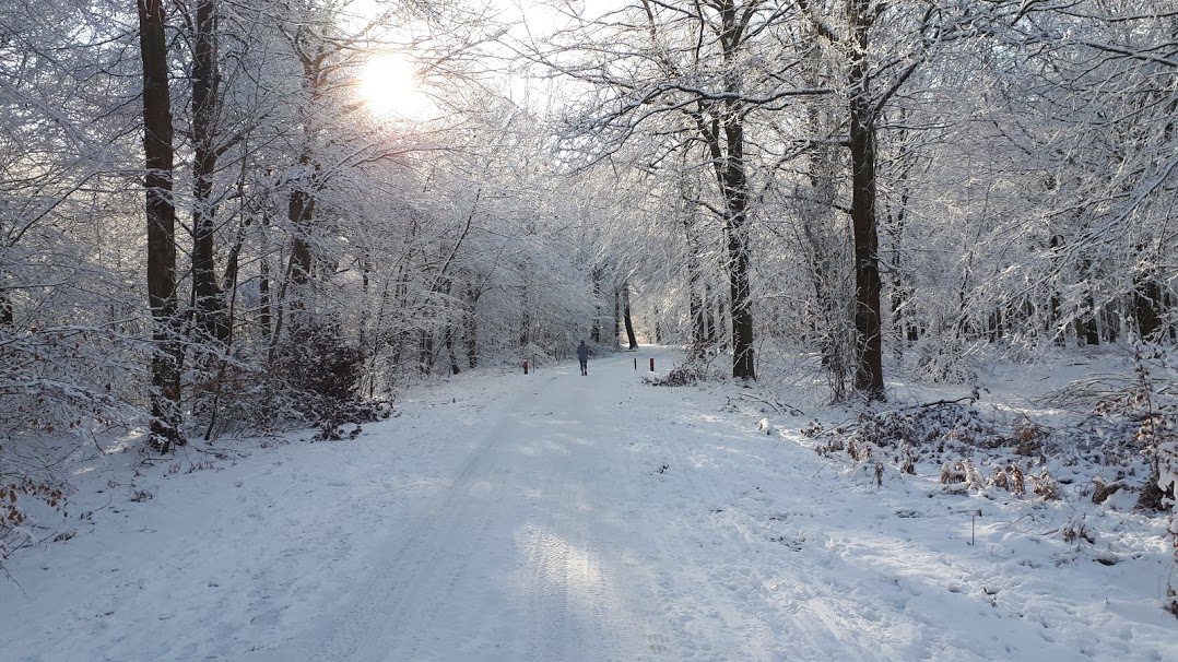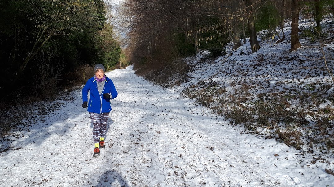 The trees were laden and all the mud of weeks past were buried under several inches of the white stuff! This, and the fact the woods had been closed off to cars made for perfect conditions for.........a run! With virgin snow on the tracks and that lovely crunchy sound under-foot that always brings back memories we were well wrapped in thermals as we plumped for using the exit road as it had no traffic, was mainly flat and a perfect mile long to the gate with a mile return. This, together with the roundabout to warden's hut trail, made for a perfect distance. A big bonus today was that the cafe owners had made it in before the gates had closed so a mid-point coffee and cake before a jog back home........perfect! The weather took a turn for the worst later in that evening as rain set in and continued, on & off until Friday when it was not-parkrun number 46 time, again. We found a window in the day at just after mid-day where we chose yet another 'modified' course as the woods still had some closed trails including The Hill trail.