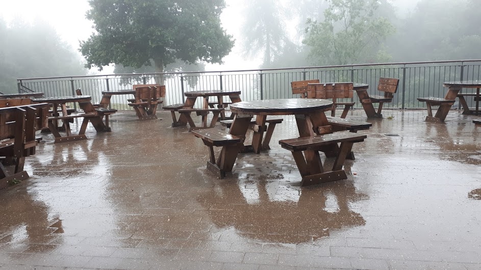 Apparently this will open in the week as an alternative draw to the cafe, in the summer, then quickly converting to hot drinks in the winter, very shrewd of the cafe owners but will interfere with parkrun start & finish if we keep to the same course.......... when it returns! Spots of rain became a steady downpour through the 'nice' section. However it didn't really matter as we were well-warmed-up and into our stride. Certainly if colder it would have been unpleasant in our T's and shorts but somehow it added to the murky atmospherics of The Woods sections. Distance sounds of chainsaws greeted us at The Hill but they were well into the thick of the woods so no pausing for felled trees today. Just plodding was the order of the day and we seem to be doing that very well. I was leading and Lesley was doing the encouragement........"keep shoulders straight, keep the arms pumping, take deep breaths, think there is a balloon on your head".........you know the score! It must have half-worked as we came in just a smidgen over 40mins but still not under......again. Back to the cafe, photoshoot in front of the 'Monkey' and a coffee and roll outside in the rain but thankfully. under the cover.
