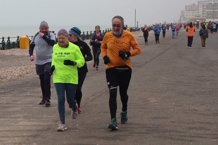 Hove Promenade is the choice of the day. Its a new parkrun to both of us and on the plus side, It is flat, it has no mud or raised flints and today it is not raining. However, a small negative is that It has no free parking. So us ageing skinflints will willingly take a 20 minute walk from our free parking spot in Hove Park( yes we know there is a parkrun there). The weather has given us a typical January bracing 4C on the prom and a murky view of nowhere along the seafront and just the one toilet to serve well over 500 starters and finishers.......and the cafe is an outdoors job but more about that after the run. First timers briefing and we are far from the most distant tourists. Newcastle it seems today but Australia is quite common apparently as the city of Brighton is very multi cultural with all of the language schools and visitors. The megaphone briefing is not at all brief as we wait for the off, shivering in anticipation or was it cold? Finally after all the thanks, milestones, up-and-coming events, appeals for volunteers, tourists and news of the day.........we are off. We have placed ourselves about 2/3rds back in anticipation of our final position as Lesley disappears off towards the west and I encounter the first 'walkers' ! With 500+ today and the promenade width reduced by the pebbles of recent storms I have to weave my way ahead for what seemed around 200metres to get a glimpse of Lesley's rear-end. By the time the initial crowd clears we are both heading nearing the first cone and the loop around to head east in the direction of Brighton, Beachy Head and beyond ( just fog today) ! Running on the flat with no hills, trees or other natural obstacles seems to make the run go quite slowly, just yard after yard of the same, beach huts on the left, sea on the right